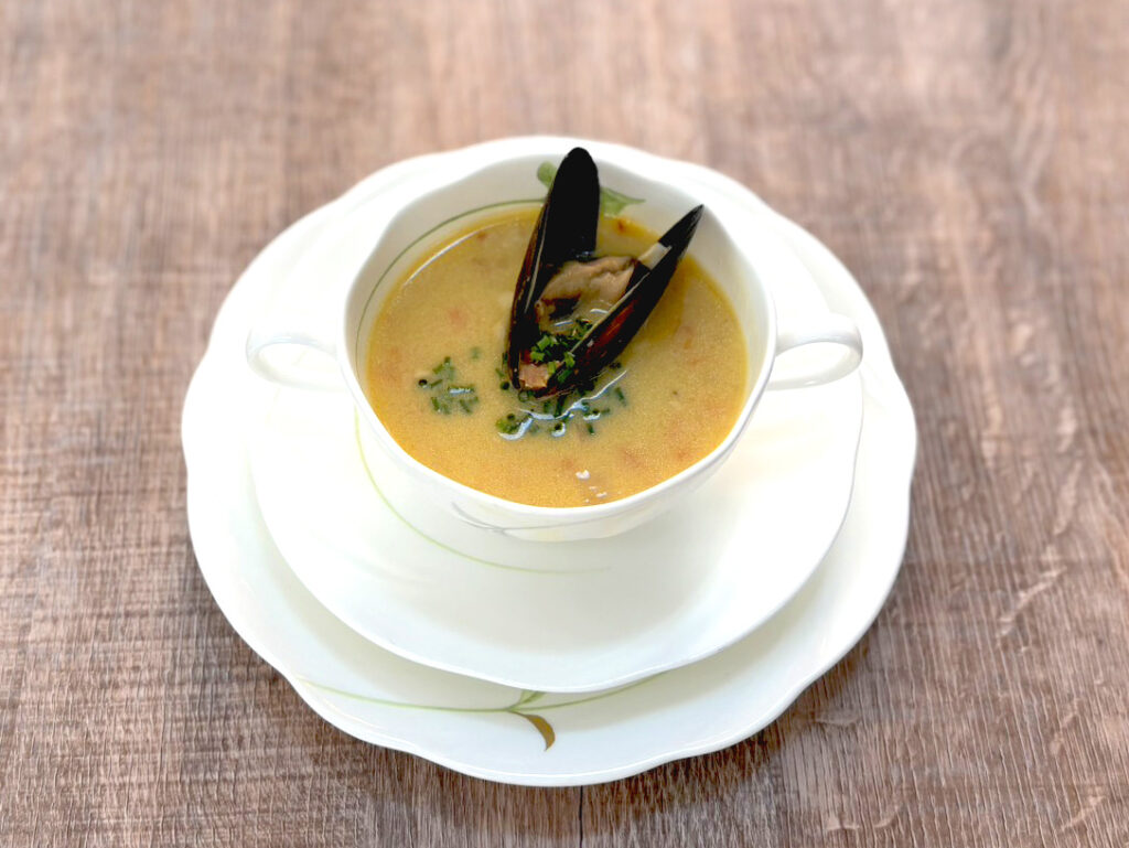 旬のあさりとムール貝のクラムチャウダー サフラン風味