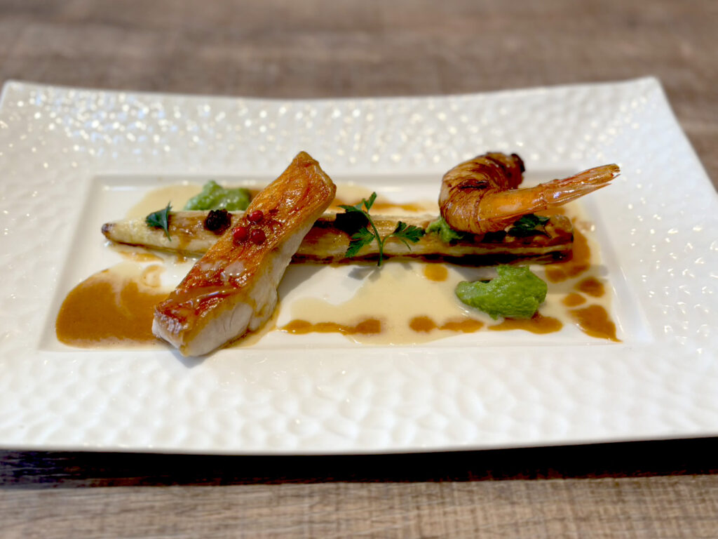 市場から届く鮮魚のポワレと車海老の新ジャガ包み フレッシュホワイトアスパラガス添え