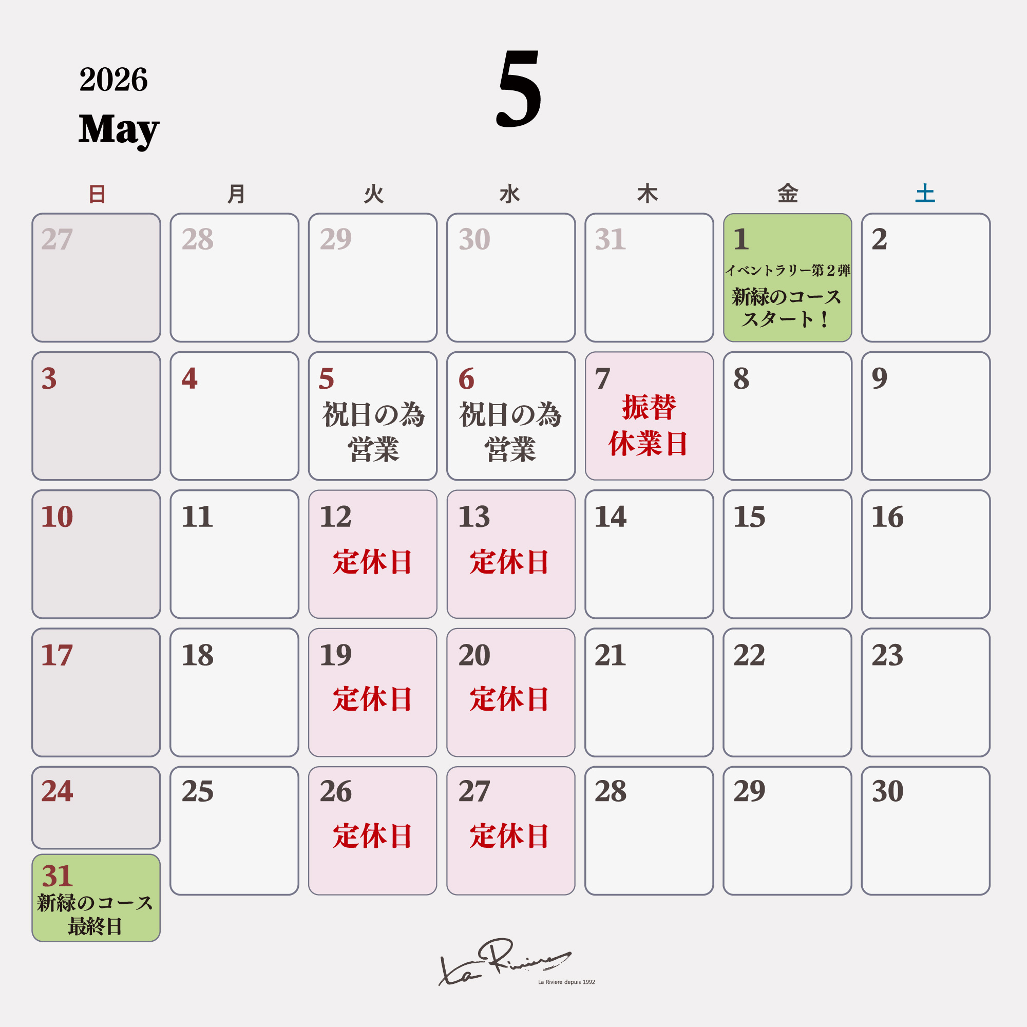 ラ・リビエールの定休日は毎週火曜日・水曜日