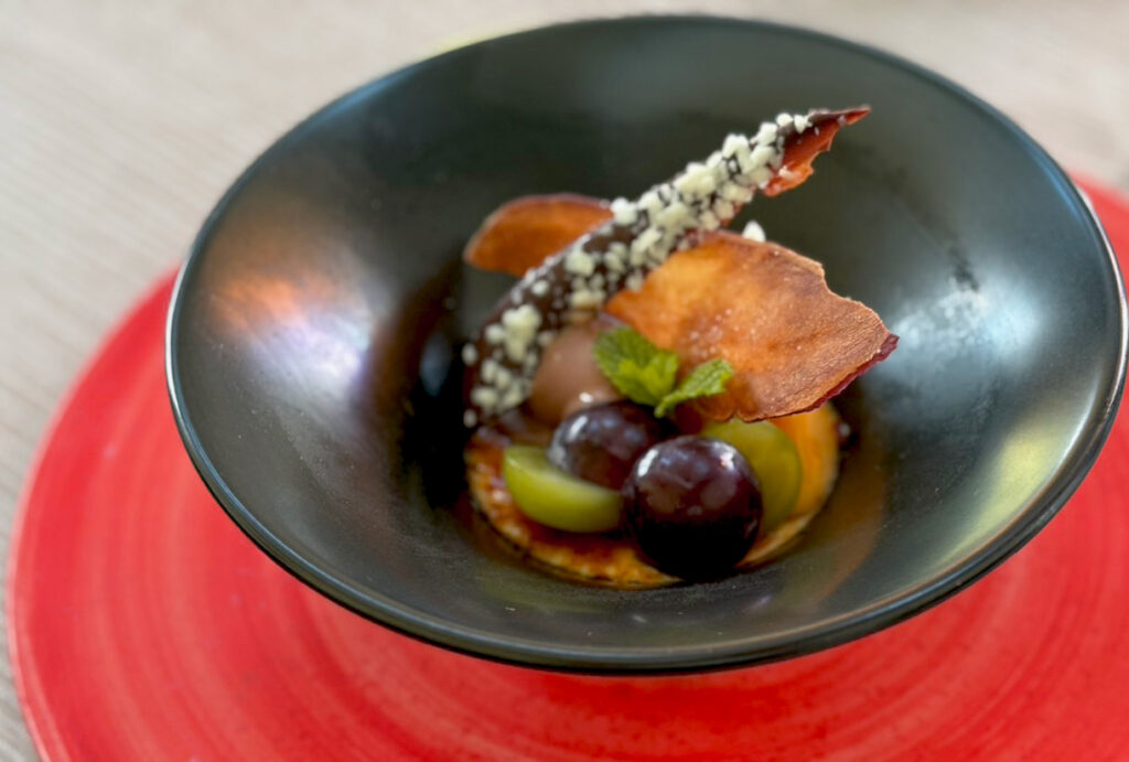 濃厚!バニラのクレームブリュレ 秋の果物とチョコレートのグラスをのせて