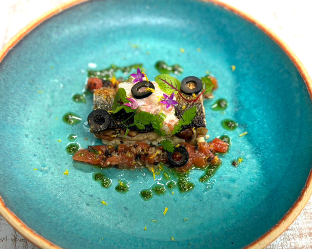 〈前菜〉旬の秋刀魚と茸のセルクル 甘エビのタルタルとオリーブのソースで