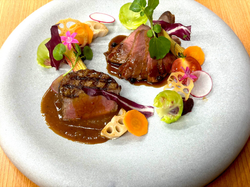 (お肉料理)特選但馬牛フィレ肉の網焼きステーキと鴨のローストアンサンブル