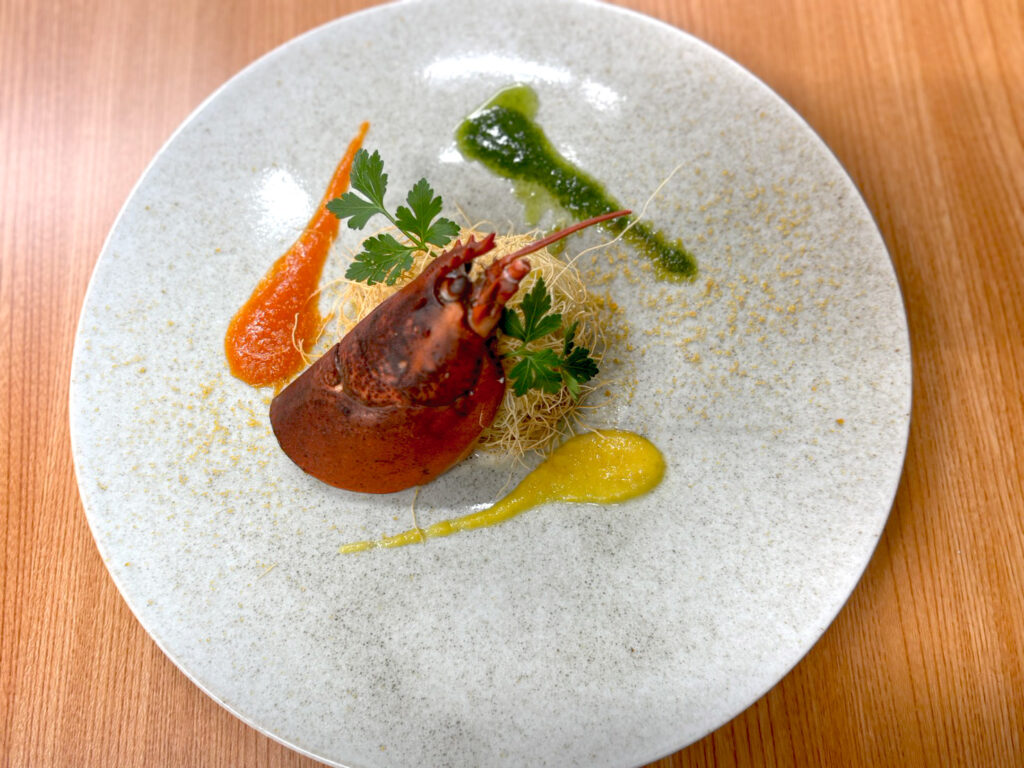 (お魚料理)カナダ産オマール海老と天然魚のカダイフ包み焼き 色鮮やかなソースと共に