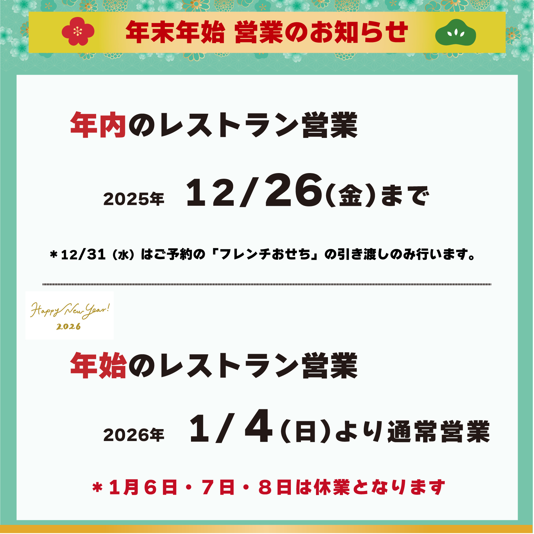 ◎年始のレストラン営業・・・2026年1月4日(日)より通常営業いたします。