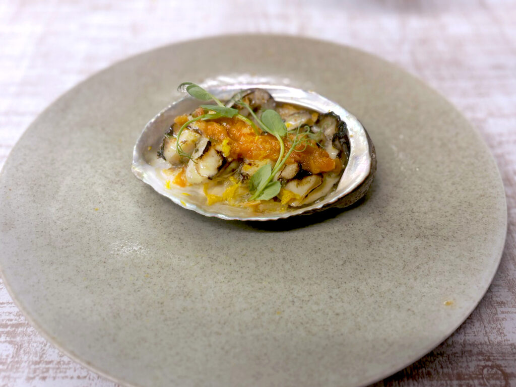 《前菜Ⅱ》竹野産 鮑と牡蠣の網焼き 白菜のブレゼとレモンケッパーソース