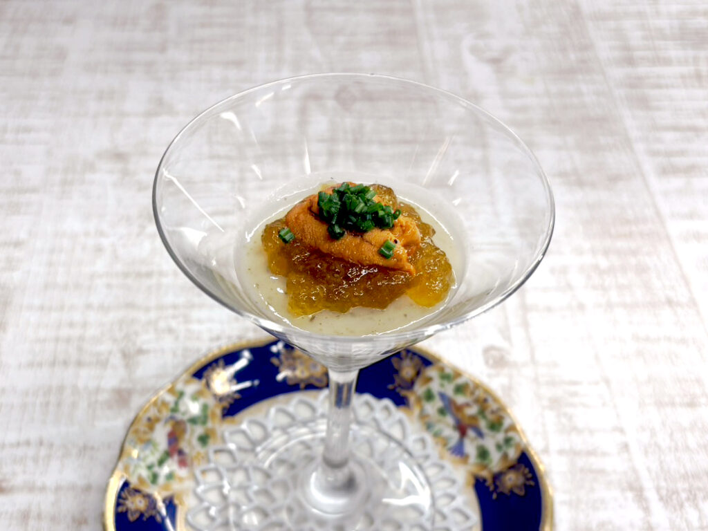 《アミューズ》菊芋の軽いムース コンソメのジュレとウニを乗せて