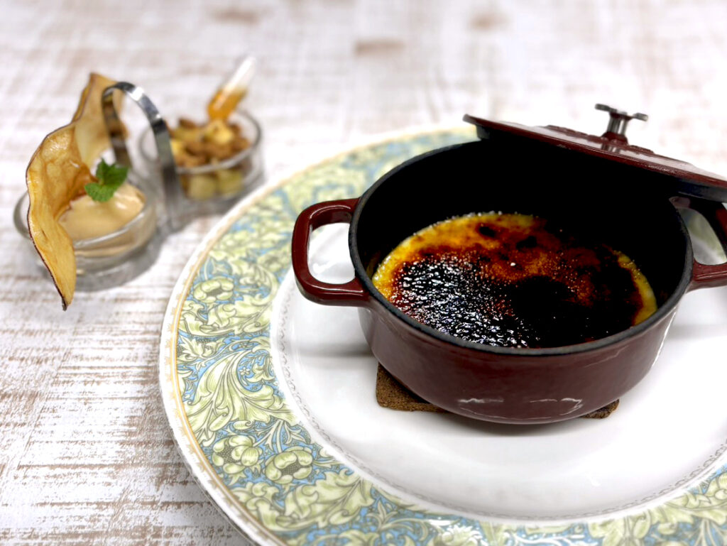 《デザート》紅はるかのクレームブリュレ ロイヤルミルクティーのグラスを添えて